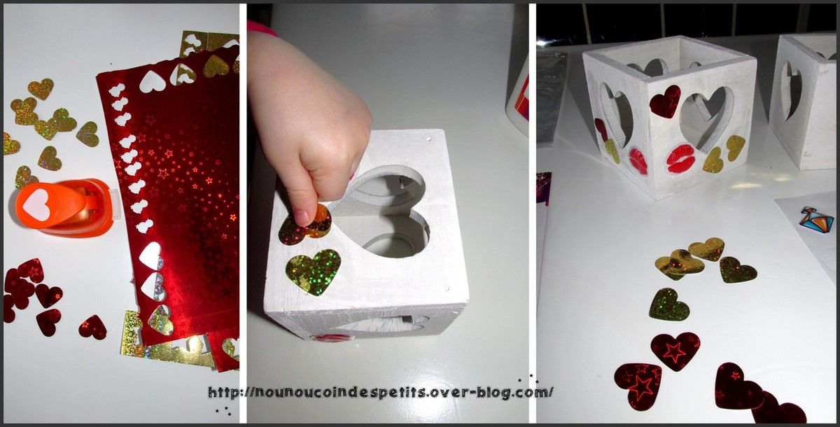 - deux tons différent, le premier tons rouge avec des bisous et des coeurs a coller sur le support en bois et le deuxième plutôt nature collage de petits coeurs et des fleurs !!